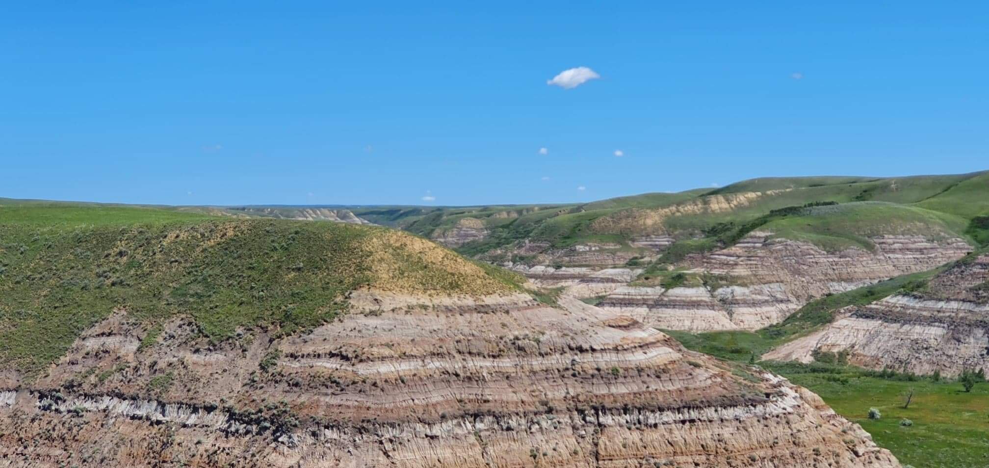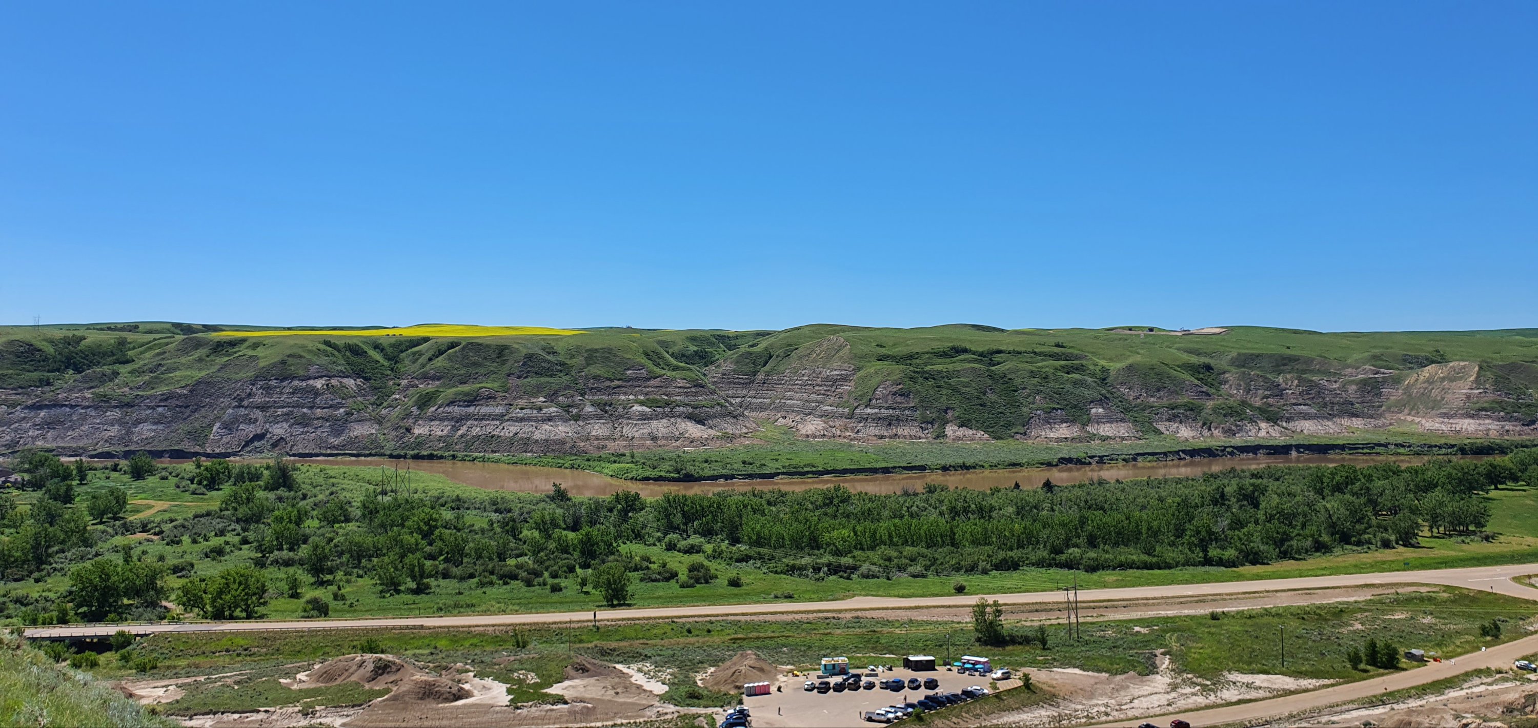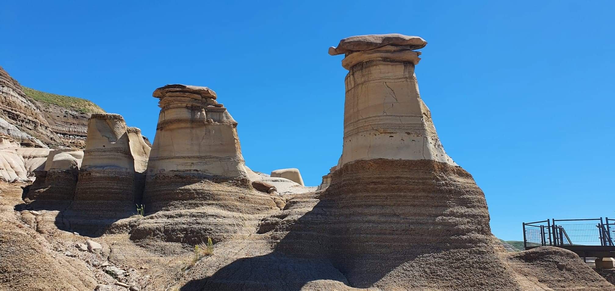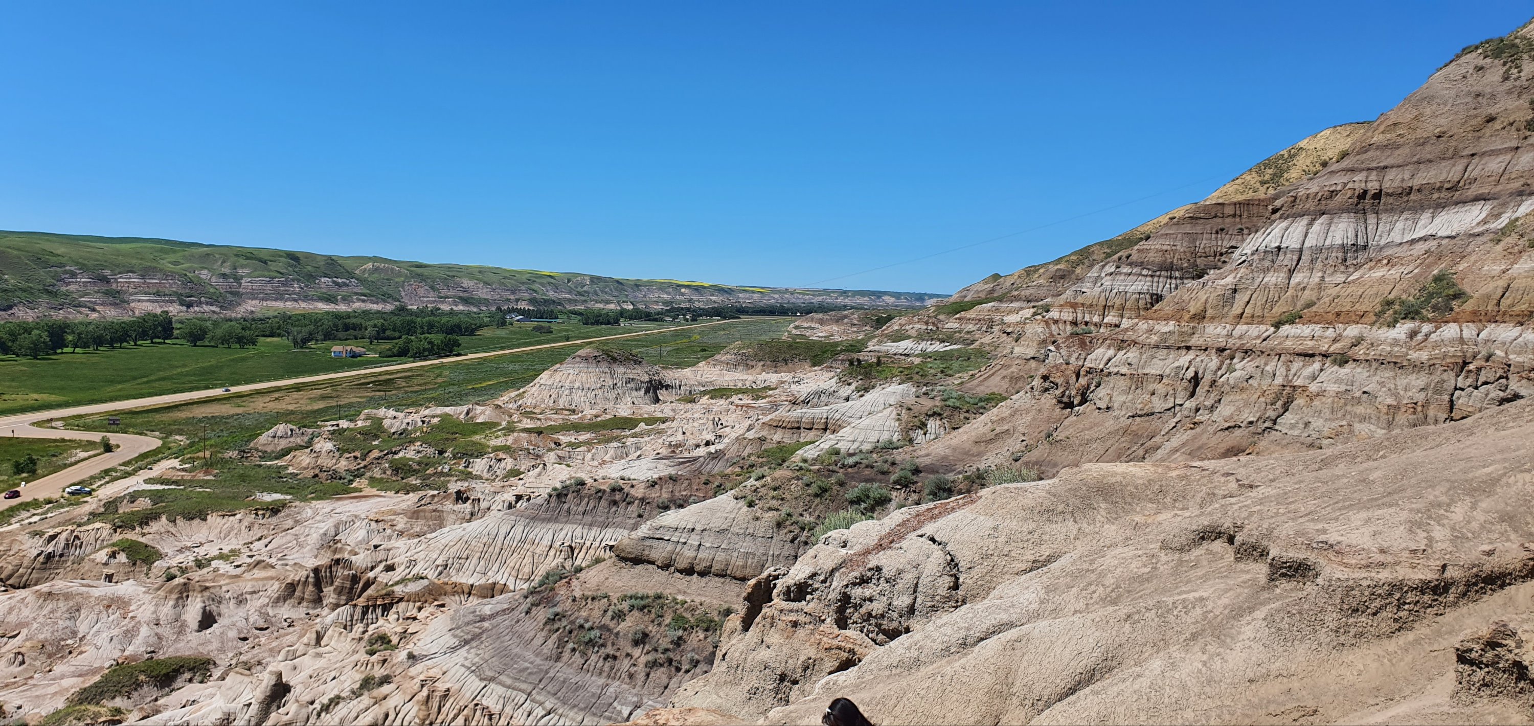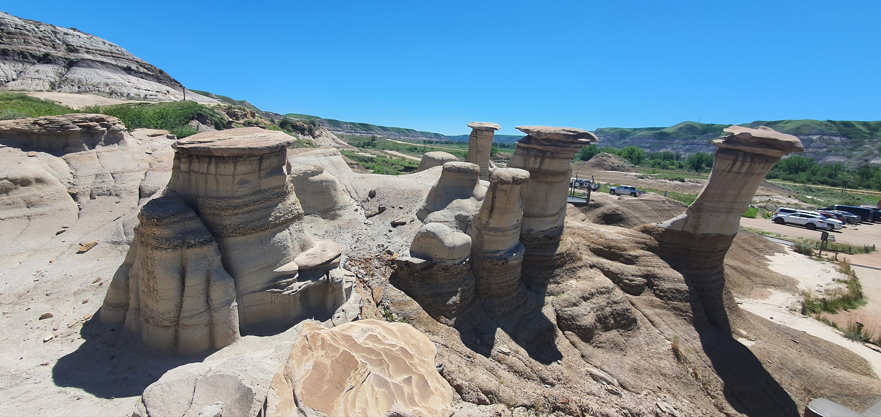 The very flat drive to Drumheller was through field after field of crops. Calgary is known for cattle ranches, but in this area it was all fields of crops. A vast amount of canola but also what looked like grain crops too.Β  Out of nowhere and in the blink of an eye we decended into a canyon like valley where all of sudden we felt like we were driving into the set of a classic western movie.Β  The walls of the canyon are layered in colouration making this lanscape completely different from those fields we had just driven for an hour or more. Drumheller is also known as the dinosaur capital of the world.Β  Here you can pay to climb inside the mouth of the world’s largest dinosaur for a fee! We did not do this. What we did do was climb the HooDoos. These are the rock formations in the walls of the canyon. It was a fairly steep and sketchy climb on a 27 degree day. We made it up to the plateau of the prairies and it was well worth the effort. Quite the view.