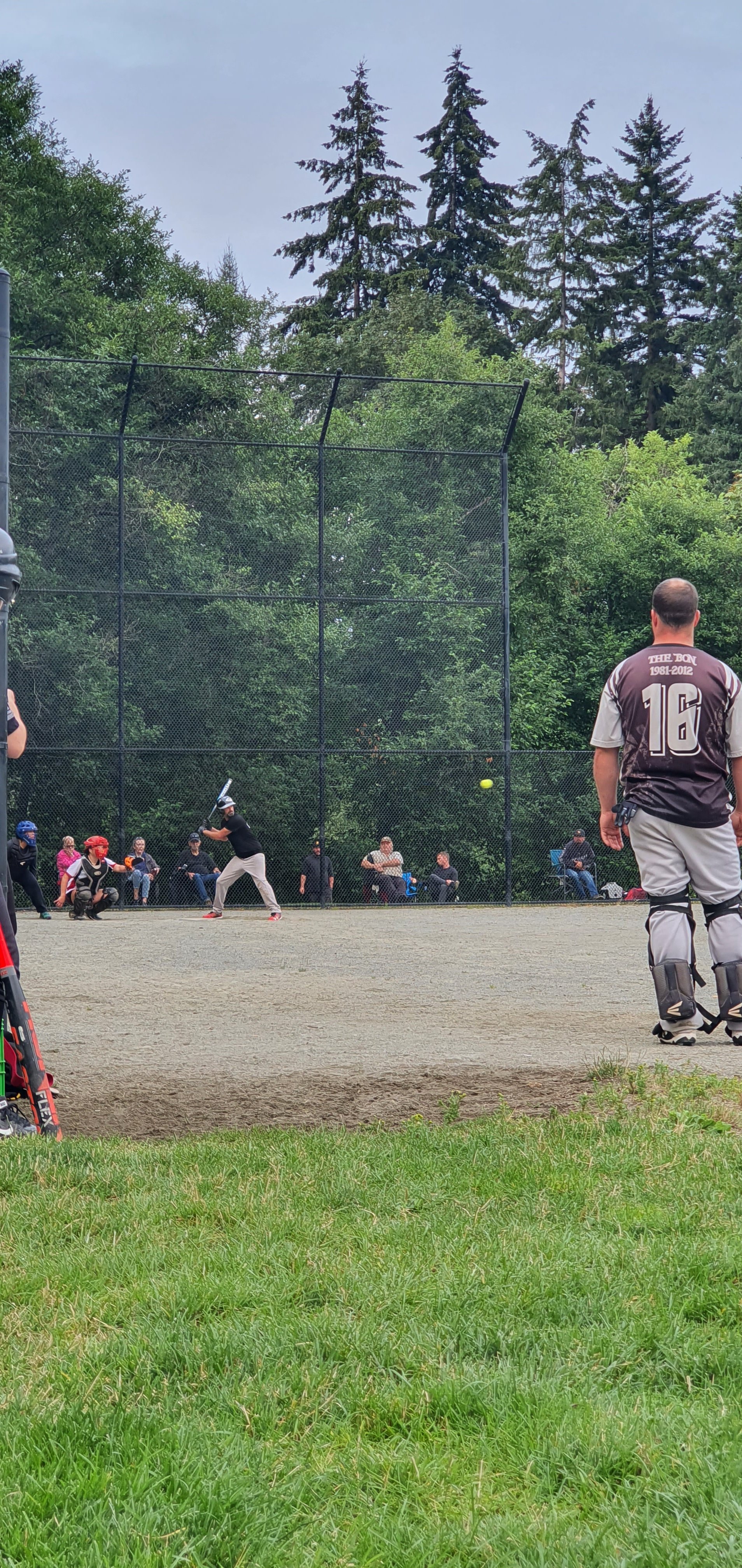 Basically the two teams came together to play two games kicking off the weekend finals. I’m not entirely sure how it all plays out, but Ricky’s team won both games. Ricky pitched for a while, then played out field. He was also in the batting line up in between beers. It was great fun to watch and Wayne became the backup base coach from his camp chair, beer in hand.