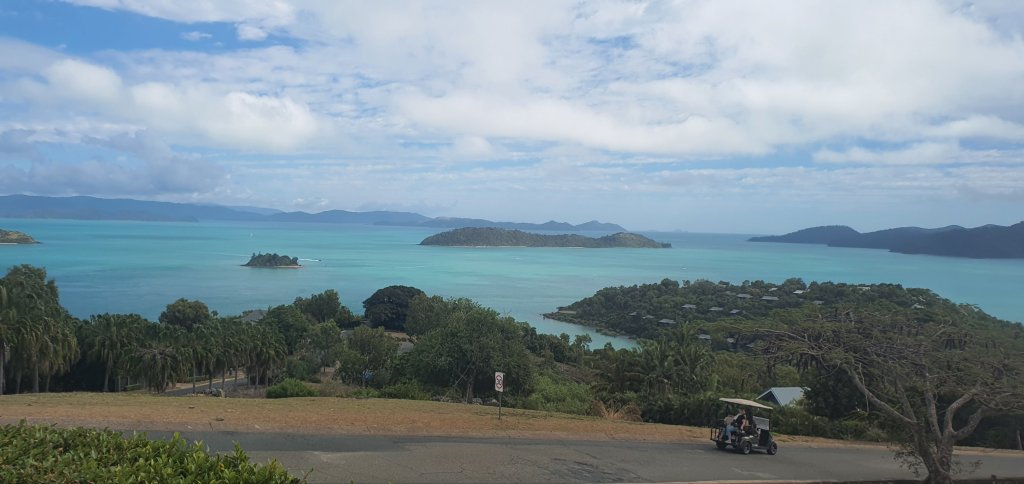 The developed side of the island is a spider web of paved streets that happily fit two golf carts abreast. This is golf cart meca and the little electric buggies are getting about everywhere. Ours loaded with 4 passengers did have some moments of slow crawling on some of the steeper sections of track which reduced us to walking speed, but no stress, the views had you distracted. The island, in true tropical form, is lush and green surrounded by the aqua blue waters that form part of the Great Barrier Reef. We did get told that the island could use some rain despite the recent wet weather events earlier in the year. Guess the tropics can also dry out quickly.